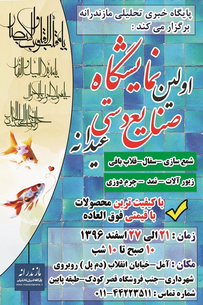 اولین نمایشگاه صنایع دستی عیدانه، به همت پایگاه خبری تحلیلی مازندرانه، در دفتر مرکزی این سایت خبری واقع در شهرستان آمل برگزار می شود.