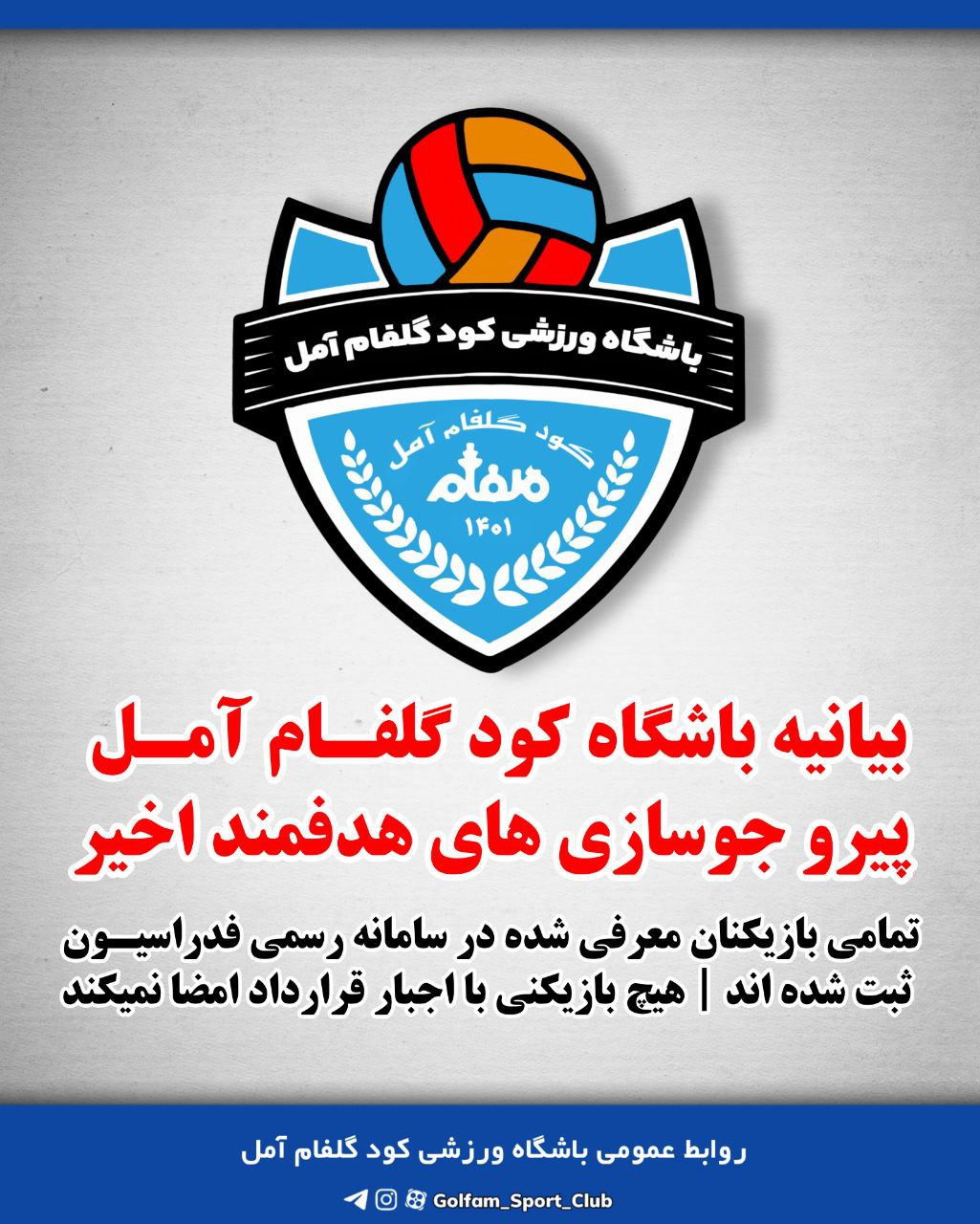 ۱- برخلاف ادعای کذب مطرح شده تمامی بازیکنان جذب شده بر قرارداد خود به کود گلفام آمل پایبند بوده و طبق اعلام سرمربی محترم از روز شنبه در تمرینات حضور خواهند یافت.