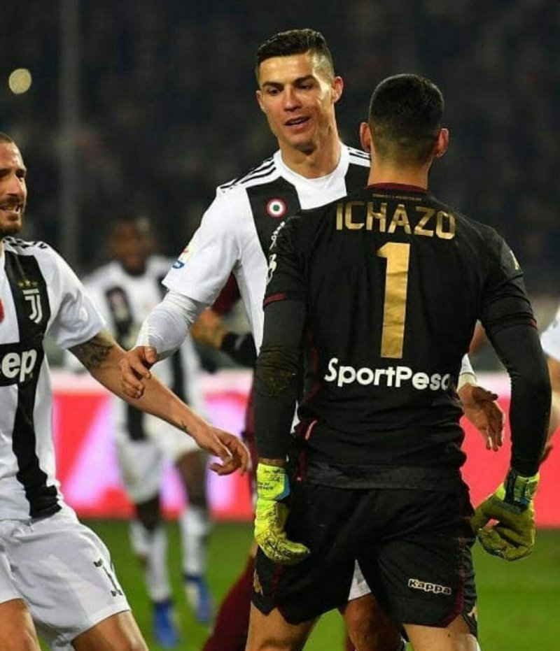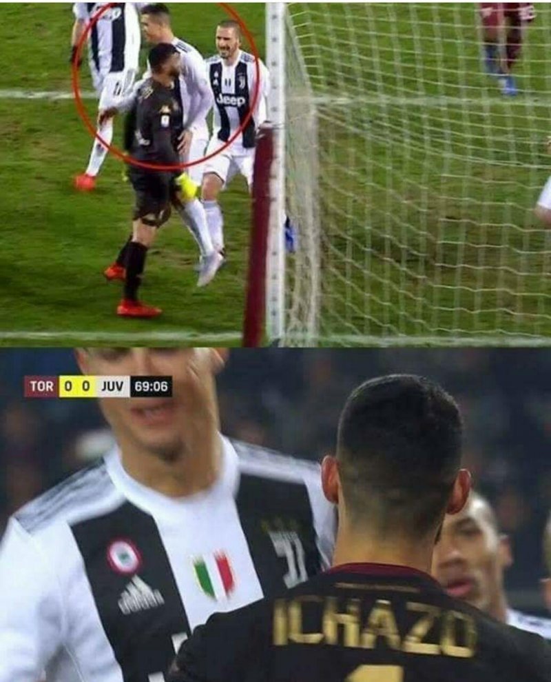 اما چیزی که بیش از همه توجهات را در این بازی جلب کرد، حرکت عجیب رونالدو پس از گلزنی بود. فوق ستاره پرتغالی بعد از گل شدن پنالتی به سمت “ایچازو” گلر تورینو رفت و با لبخندی کنایه آمیز تنه ای به او زد. این حرکت بلافاصله از سوی داور با کارت زرد مواجه شد که تعجب رونالدو را به دنبال داشت. او معتقد بود که برخورد او بدون هیچ قصد و غرضی بوده و دقایقی بعد با رفتن به سمت ایچازو که از دست او خشمگین نیز شده بود، اقدام به عذرخواهی کرد تا در همان زمین همه چیز حل و فصل شود.