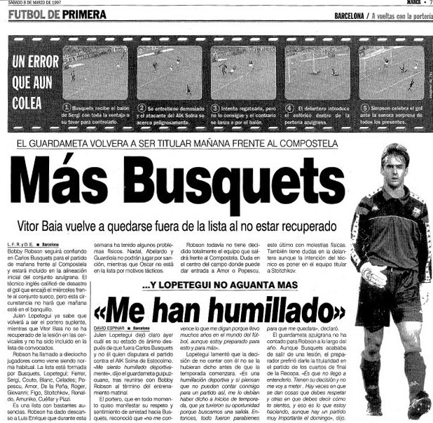 کمی بعد کرویف ترجیح داد برای بازی برابر فیورنتینا، بوسکتس و آنگوی را به فلورانس ببرد و لوپتگی در بارسلونا باقی ماند:« این یک ضربه سخت برای من است. فکر نمی کنم هدف مربی سیستم چرخشی باشد. او در بارسلونا مرا گذاشت و تمام. اگر هر سه ماه یک بار بازی کنم نشان دادن شایستگی هایم کار سختی خواهد بود.»