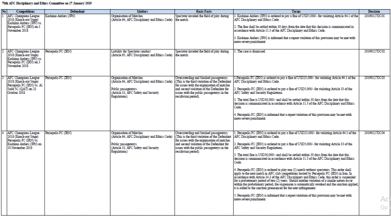 متن کامل احکام کمیته انضباطی و اخلاق ای اف سی در هفتادمین جلسه ای که تشکیل داد، به این شرح است: