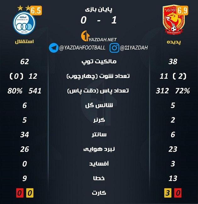 پدیده بعد از یک تساوی و دو پیروزی که آنها را به کورس مدعیان بازگرداند، در دیدار اخیرش شکست بدموقعی مقابل نساجی مازندران داشت ولی آنها امشب که به مصاف استقلال تهران رفتند، شروع خوبی داشتند و روی یک ضد حمله سریع، با سرعت بالای بهنام برزای و گلزنی او پیش افتادند؛ در ادامه مسابقه آبیها که دروازه خود را با گل بازیکن سابق خود باز شده دیده بودند، تلاش زیادی کردند تا نتیجه را جبران و به تساوی یا حتی برتری برسند ولی حملات آنها یکی پس از دیگری هدر رفت تا شاگردان یحیی این مسابقه بزرگ را با برتری پشت سر بگذارند.