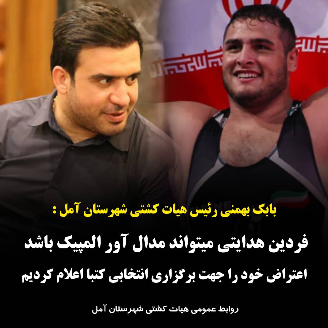 بهمنی در ادامه افزود : وظیفه ما است که از حق فردین هدایتی در آستانه مسابقات المپیک پاریس دفاع کنیم و از این کشتی گیر شایسته آملی حمایت کنیم . در همین راستا به صورت کتبی به فدراسیون کشتی جمهوری اسلامی ایران نامه زده ایم تا مسابقه انتخابی بین او و میرزاده برگزار شود .