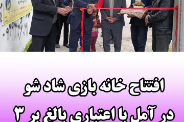 روز گذشته مراسم افتتاحیه خانه بازی شادشو به مدیریت خانم زهرا عسکری واقع در آمل ، رضوان ۲۹ در محیطی زیبا و دلنشین با حضور عصمتی معاونت برنامه ریزی فرمانداری آمل ، مکاری رییس شورای شهر آمل ، هاشمی رییس ثبت احوال و نیکوکار رییس کمیته امداد آمل با اعتباری بالغ بر ۳۵۰ میلیون تومان انجام شد.