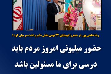 صبح امروز رضا حاجی پور نماینده مردم آمل در مجلس شورای اسلامی در جمع راهپیمایان ۲۲ بهمن در مصلی دابودشت ضمن تشکر از حضور پرشور ملت بزرگ ایران به خصوص مردم استان مازندران و شهرستان هزار سنگر آمل در راهپیمایی بیان کرد: حضور باشکوه مردم علارغم تمامی مشکلات موجود در کشور پیامی روشن و واضح برای ما مسولان می باشد؛ باید در کنار مردم باشیم و در راستای رفع مشکلاتشان هر چه سریعتر گام برداریم .